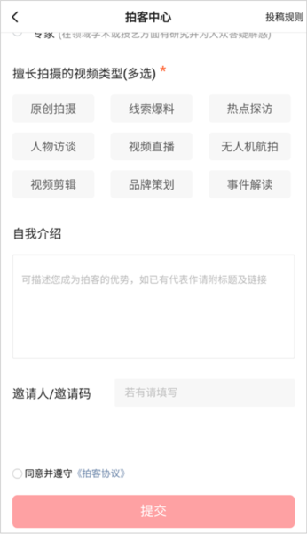 3、填写个人所在地、擅长视频类型等基本信息,点击完成提交申请。