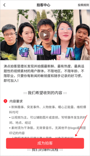 2、进入拍客中心后,点击页面底部的“成为拍客”按钮。