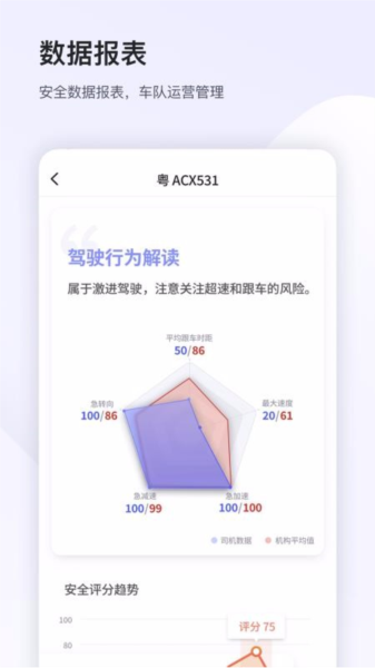 1、生成详细数据报表,选定车辆即可查看安全评分变化趋势与驾驶行为分析;