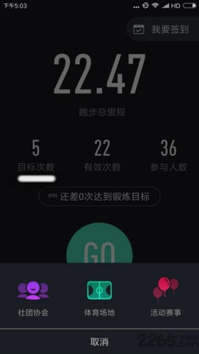 点击“运动签到”后显示“社团签到、场地签到、赛事活动”选项,进入列表即可点击签到;