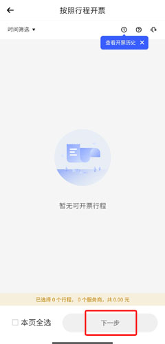 4、勾选需要开票的行程记录,点击下一步,随后按照页面提示完成后续信息填写与提交即可。