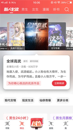 海量书库:各类推荐与分类书库涵盖玄幻、穿越、都市、言情、经管、校园、历史等,排行榜单包括月票榜、热评榜、会员点击榜等,方便寻找热门作品;