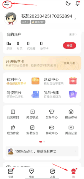 首先下载安装起点读书应用,进入“我的”界面,点击左上角图标。