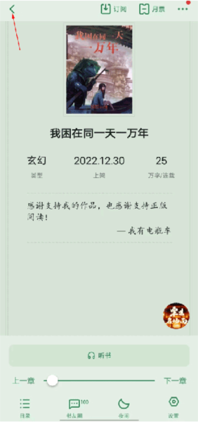若仅需退出当前阅读界面,轻触屏幕中央任意位置,点击左上角返回按钮即可退出。