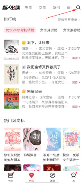 1、进入应用后,界面左下角显示“书架”与“精选”选项,右下角为“我”和“发现”选项,顶部为搜索栏。