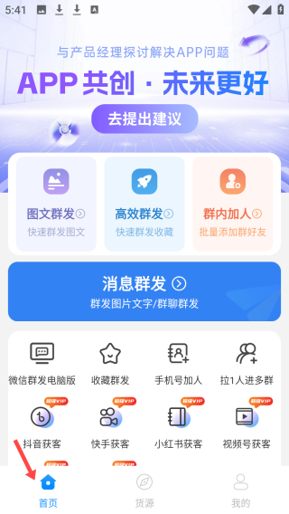 1、进入首页,可体验APP共创功能,使用图文群发、消息群发等服务,也能使用多平台获客等选项。