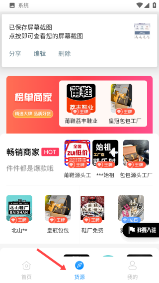 2、进入货源界面,会展示热门榜单与畅销商家货源,例如北山羊鞋厂等,并提供分类导航。