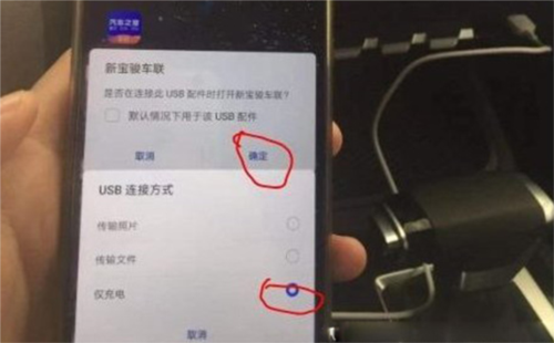 2、打开手机上的新宝骏APP,使用数据线连接手机与车机;勾选“默认情况下用于该USB配件”选项并确认,在后续提示中选择“仅充电”连接模式。