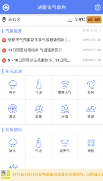 5、查询定位城市的当前实况温度、湿度、风力风速、预警信号等信息,以及5天预报与趋势;湖南省内城市还可查看3小时精细化预报。