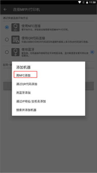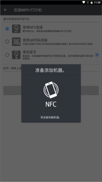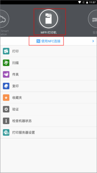 1、打开应用主界面,切换至【MFP/打印机】页,点击“使用NFC连接”。