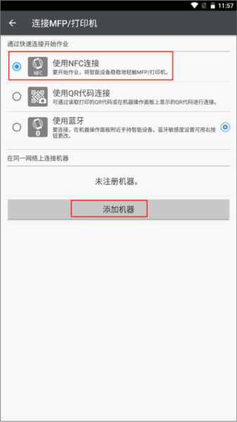 2、页面提供多种连接方式,以NFC连接为例,点击下方添加机器按钮。