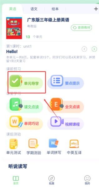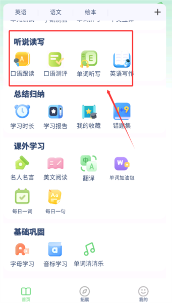 在首页可以选择语种,根据提示进行跟学,这样能巩固知识,提升学习效果。