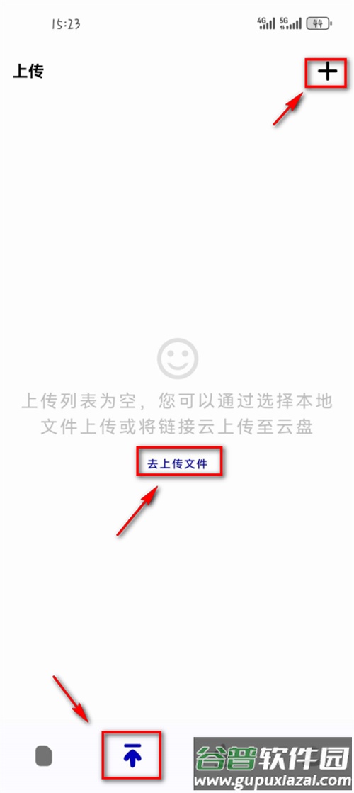 4、新注册用户可直接点击中间“去上传文件”按钮;老用户则点击右上角“+”号进行上传。
