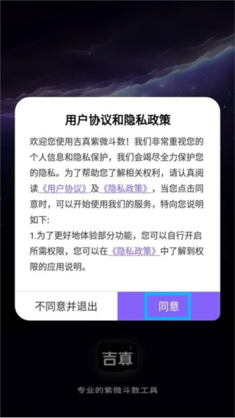 下载并打开吉真紫微斗数,阅读用户协议与隐私政策,点击【同意】;