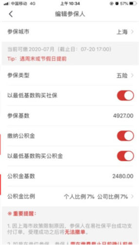 5、选定类型后,默认按最低基数购买社保,基数可手动调整;如需缴纳公积金,可点亮对应按钮,基数同样支持修改;