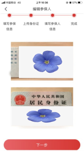 6、上传参保人身份证正反面照片,上传成功后点击“下一步”;