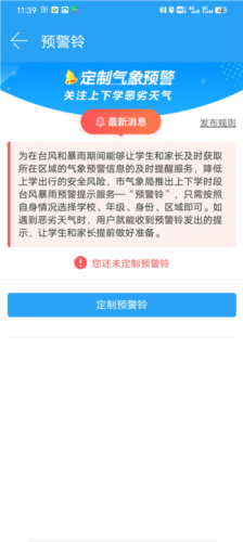2、为在台风暴雨天气下,帮助学生及家长及时获取所在区域的气象预警,降低上下学途中的安全风险,市气象局推出了上下学时段预警提示服务“预警铃”;点击页面上的定制预警铃按钮;