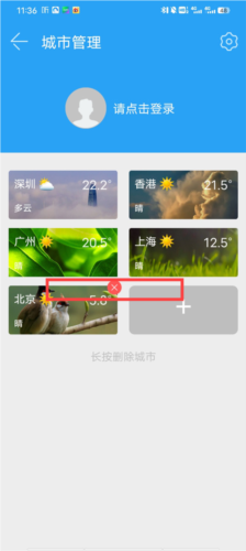 3、长按后城市旁边会出现删除符号,点击该符号即可完成删除。