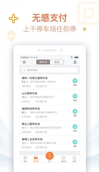 4、接入众多停车场,实时显示车位并支持无感支付。