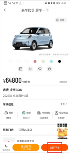 2、选定车型后,进入详情页面,点击立即下单按钮