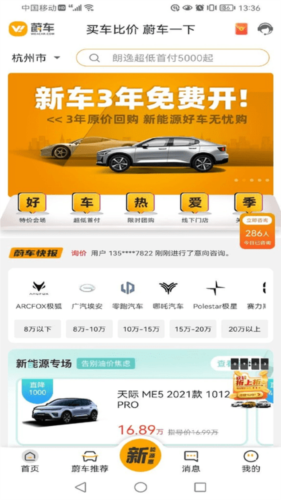 蔚车app作为国内主流的线上购车平台,通过互联网技术革新传统汽车销售流程,致力于提升用户选车购车的整体效率与服务品质。平台采用线上商城与线下实体门店结合的模式,为用户提供真实可靠的车源与完善的售后保障,让买车过程更省心。软件内汇集众多汽车品牌与车型,方便用户随时对比价格,快速锁定理想车辆。同时平台定期推出特价车源与购车优惠,帮助用户以更经济的成本购入优质新车,有效促进汽车市场消费。