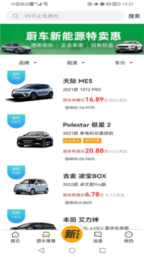 1、打开蔚车app,在推荐页面浏览并选择喜欢的汽车,或直接搜索目标品牌