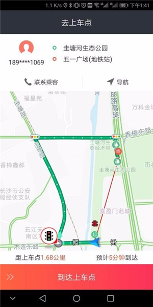 2、接单后使用导航功能前往上车点,到达后确认位置并联系乘客;