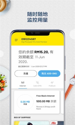 随时上网:若数据流量耗尽,轻点按钮即可快速订购互联网附加套餐或境外漫游通行证;