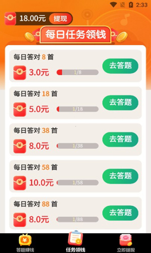 2、平台提供多样赚钱任务与活动,单题收益最低0.3元起;