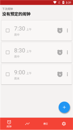1、安装应用后打开,主界面呈现已设定的闹钟列表,布局清爽。