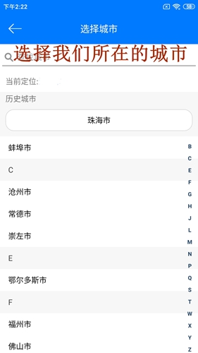启动应用后,点击左上角的城市名称,进入城市列表,选择您当前所在的城市。