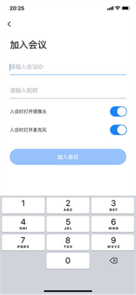 未注册用户可直接点击首页“加入会议”匿名参会。需输入9位或10位会议ID及自定义昵称,并可选择是否开启摄像头与麦克风。点击加入会议即可进入对应房间。