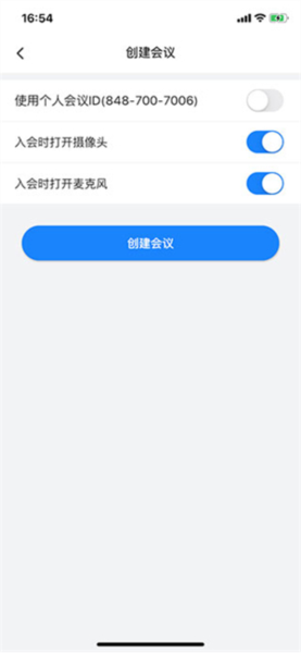 点击主界面“创建会议”,进入设置页。系统为注册用户分配10位个人会议ID,也可选择使用9位随机会议ID。可设置入会时摄像头与麦克风状态。点击创建会议按钮即可立即发起会议。