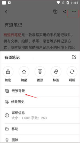 3、点击右侧更多按钮,可设置笔记背景或调整视图模式;