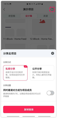 8、在项目首页点击右上角分享图标,复制链接即可发送给他人在线预览。