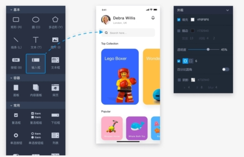 4、基于组件的交互:在保持低保真视觉定位的同时,提供了高保真的组件交互设置能力;支持页面与组件层级的动画效果,操作直观且学习成本较低。