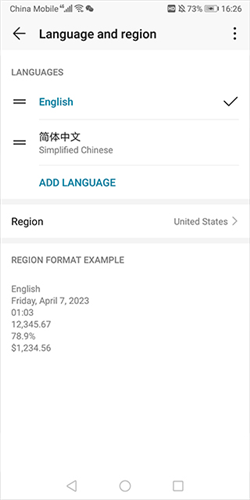部分机型无需重启设备,修改后应用界面将立即转换为英文显示。