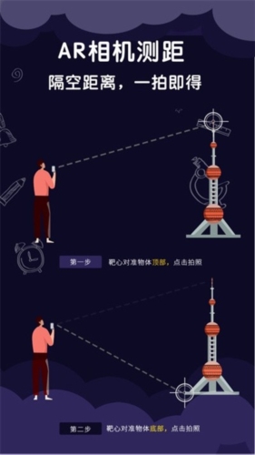 2、测高仪采用AR技术,仅需三步:输入参考身高、对准物体底部拍照、再移动至顶部拍照,就能测算出人或建筑物的高度,方法简便。