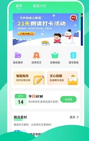 3、个性阅读:内置超过两万篇美文与十万条素材资源,实现智能内容推荐;