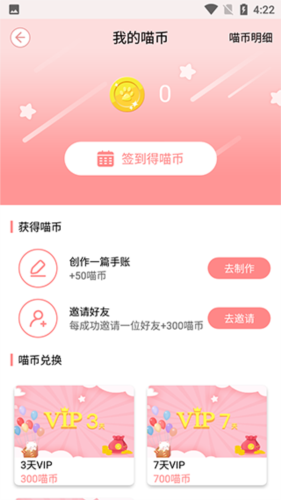 2. 通过签到与完成指定任务可获得喵币奖励,积累足够喵币后可兑换VIP会员,解锁更多专属功能与素材。