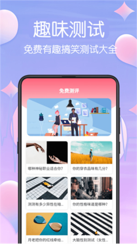 1、测试类型丰富,包括专业测评、情感评估、职业测试及趣味测验;
