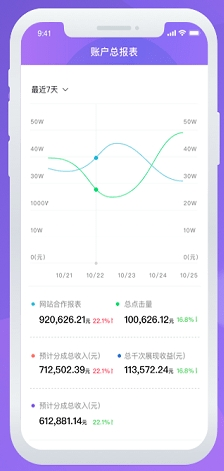 3、数据报表详尽丰富:提供账户整体及各细分业务的收益报表,清晰展示每个代码位的收入详情;