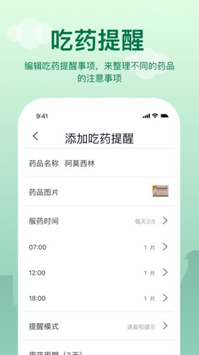 2、针对服药需求,能按用药频率设定周期提醒,时间一到便会自动发送通知;