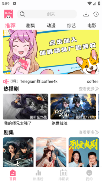 1、下载安装后打开软件,进入首页可浏览推荐的剧集、动漫、综艺等资源,上下滑动屏幕查看更多内容。