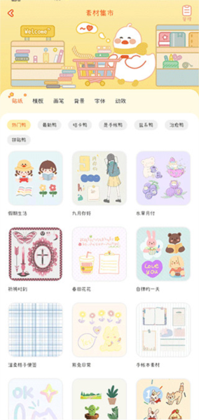 3、整体风格治愈又可爱,萌趣的手帐鸭陪伴你书写;你可以在温馨的氛围中自由拼贴、记录生活。