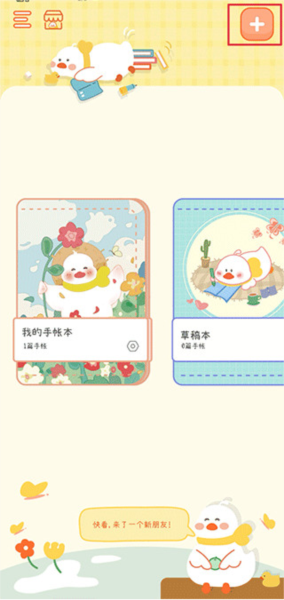 1、打开爱鸭手帐应用,在首页点击右上角的加号按钮。