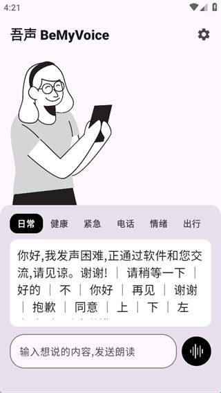 吾声BeMyVoice安卓版本专为语言障碍人士设计,是一款辅助发声的实用工具。它服务于因脑瘫、渐冻症、声带损伤或术后失声等无法正常说话的用户,帮助他们通过文字转换语音的方式重新建立沟通纽带。用户可自定义语速与语调,从而更轻松地表达个人需求与想法。