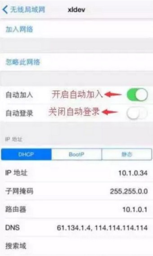 方法二:在手机【设置】的【wifi】详细页面中,关闭“自动登录”选项,同时开启“自动加入”功能。