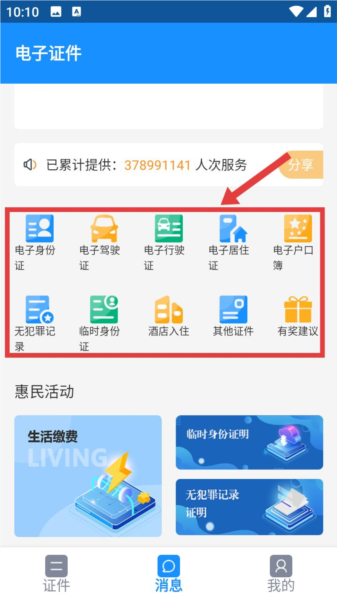 1、电子证件页面集成了身份证、驾驶证等十余种常用证照,累计服务已超3亿人次;该功能覆盖酒店入住、无犯罪记录证明开具等多个场景,为居民提供快捷的亮证服务。