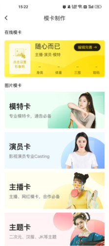 提供个性化制作服务,用户能依据自身需求与风格定制专属模特卡、演员卡等演艺名片;